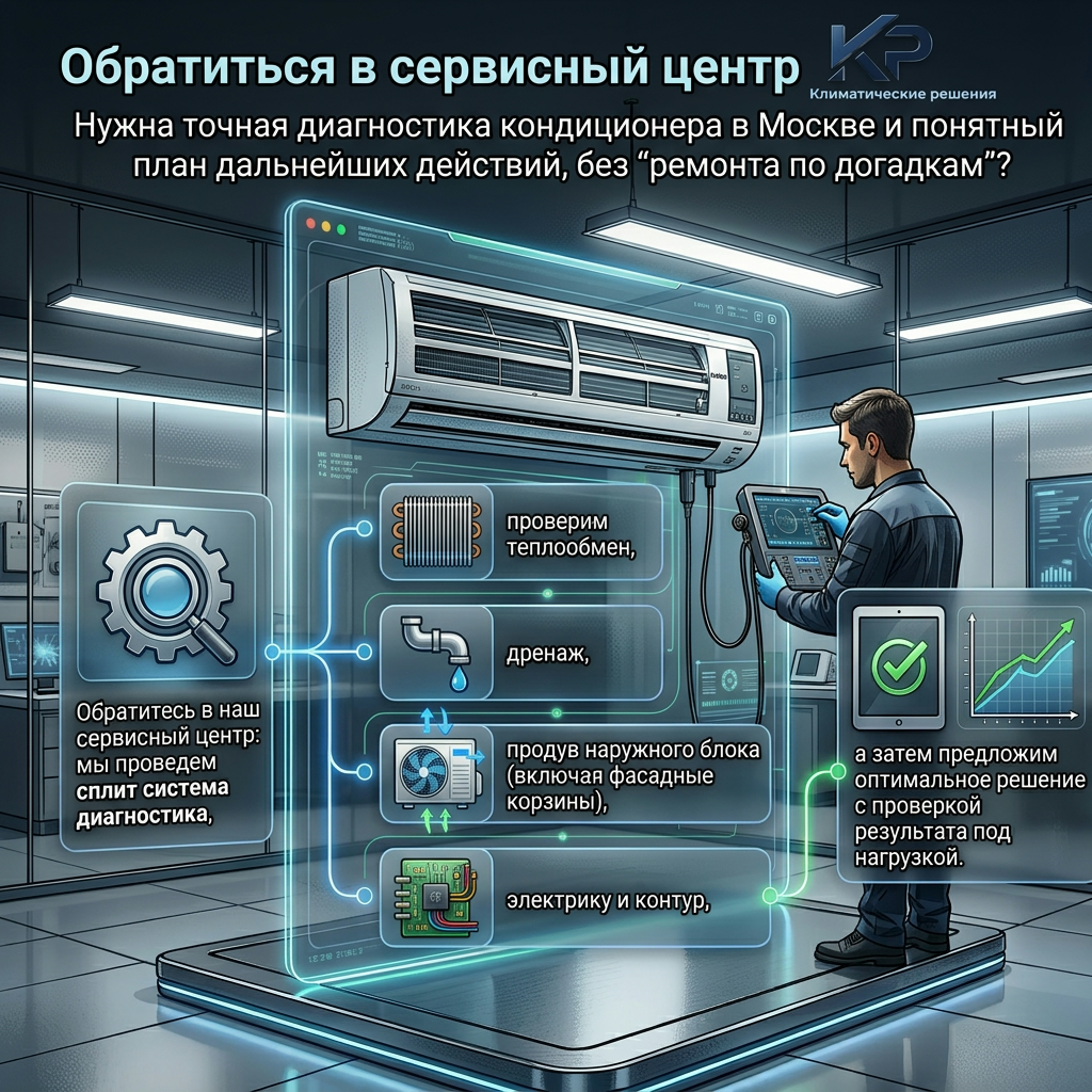 Нужна точная диагностика кондиционера в Москве и понятный план действий без “ремонта по догадкам”? Обратитесь именно в наш сервисный центр: мы выполняем диагностику сплит системы по регламенту, учитываем условия наружного блока (корзина, лоджия, перегрев), проверяем дренаж, электрику, ошибки и контур по показаниям. Вы получаете подтвержденную причину и решение, которое не развалится в сезон.