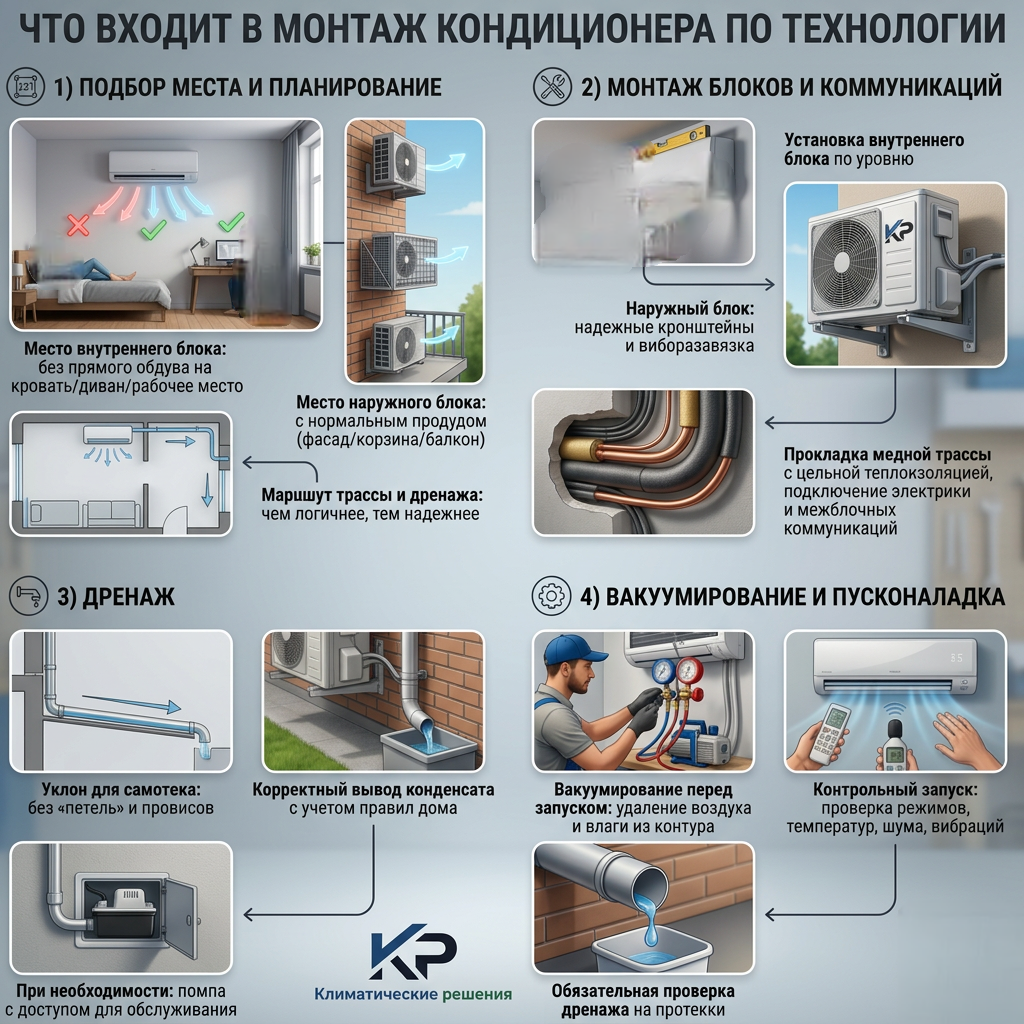 Просите состав работ и контроль: вакуумирование, тест дренажа, пусконаладка, цельная изоляция, оценка продува наружного блока и виброразвязка.