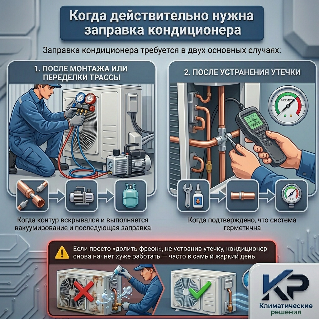 При подозрении подтверждаем утечку и устраняем причину. Без этого заправка не имеет смысла.