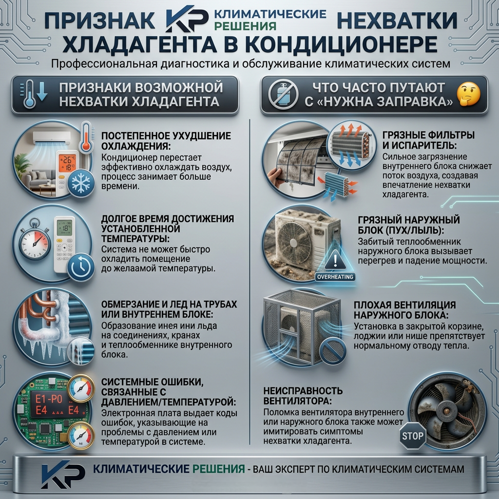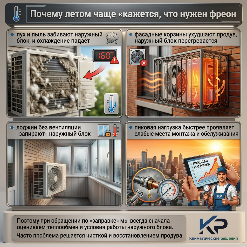Если охлаждение ухудшается постепенно, появляется обмерзание, кондиционер дольше выходит на режим или выдает ошибки. Но сначала важно исключить загрязнение и перегрев наружного блока, что для Москвы очень типично.