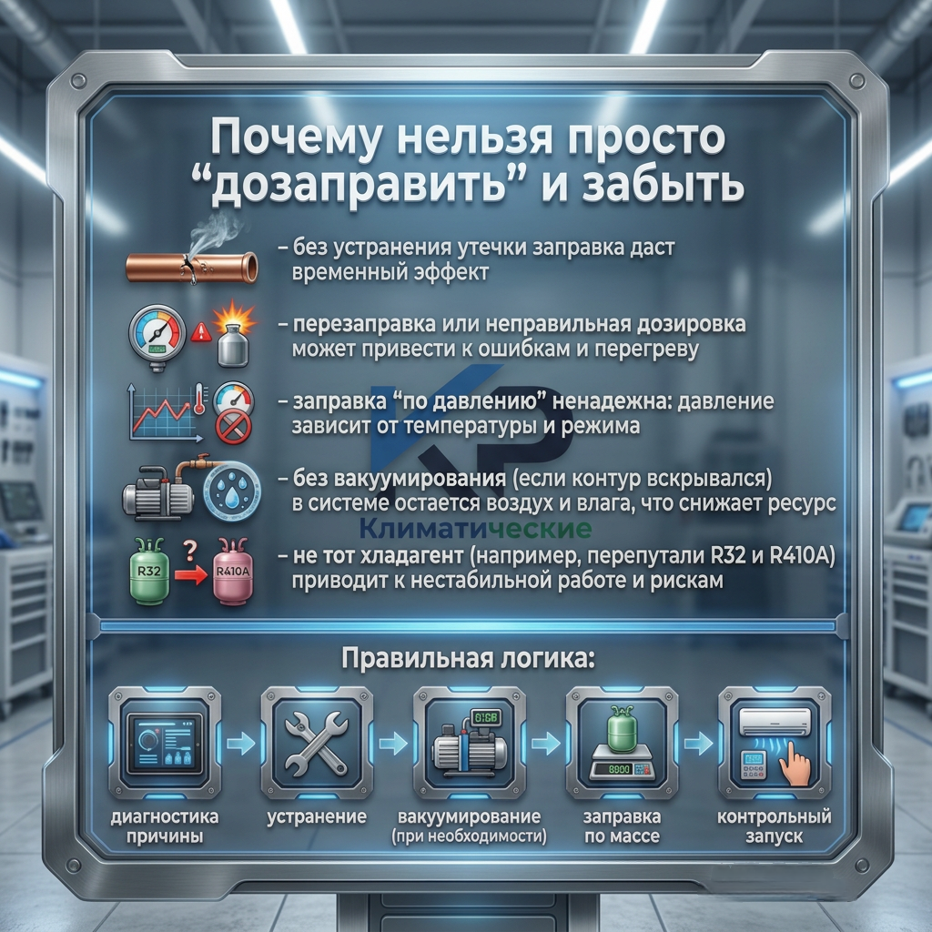 Итог: заправка по массе плюс контрольный запуск это то, что отличает сервисный результат от “долива на 5 минут”.