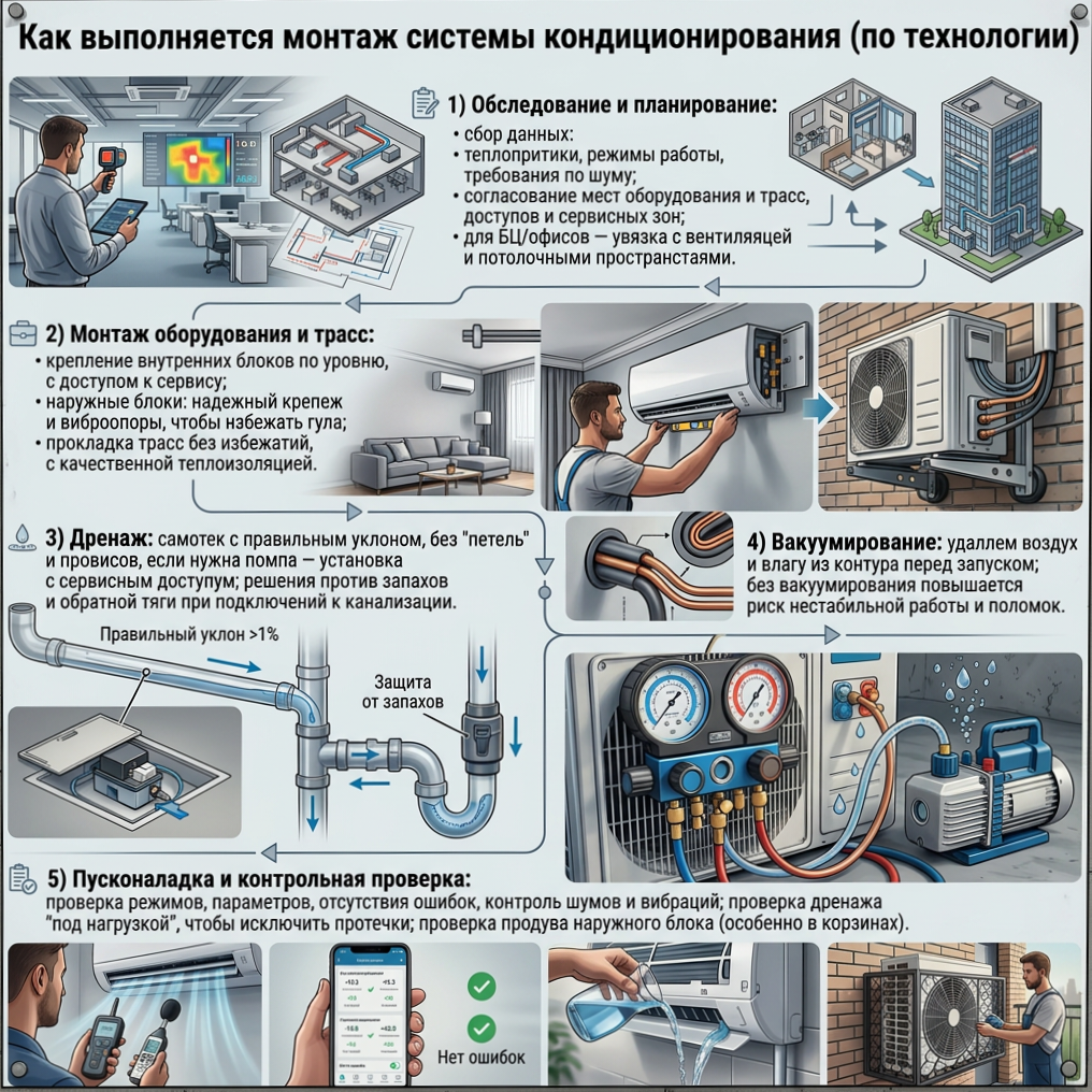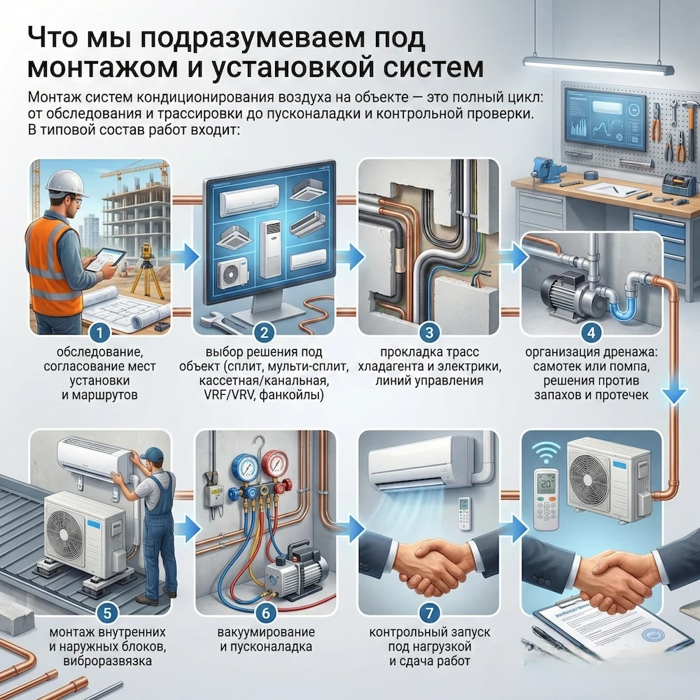 Монтаж кондиционирования воздуха на объекте это полный цикл: от обследования и трассировки до пусконаладки и контрольной проверки. Если кратко, монтаж система кондиционирования воздуха включает: