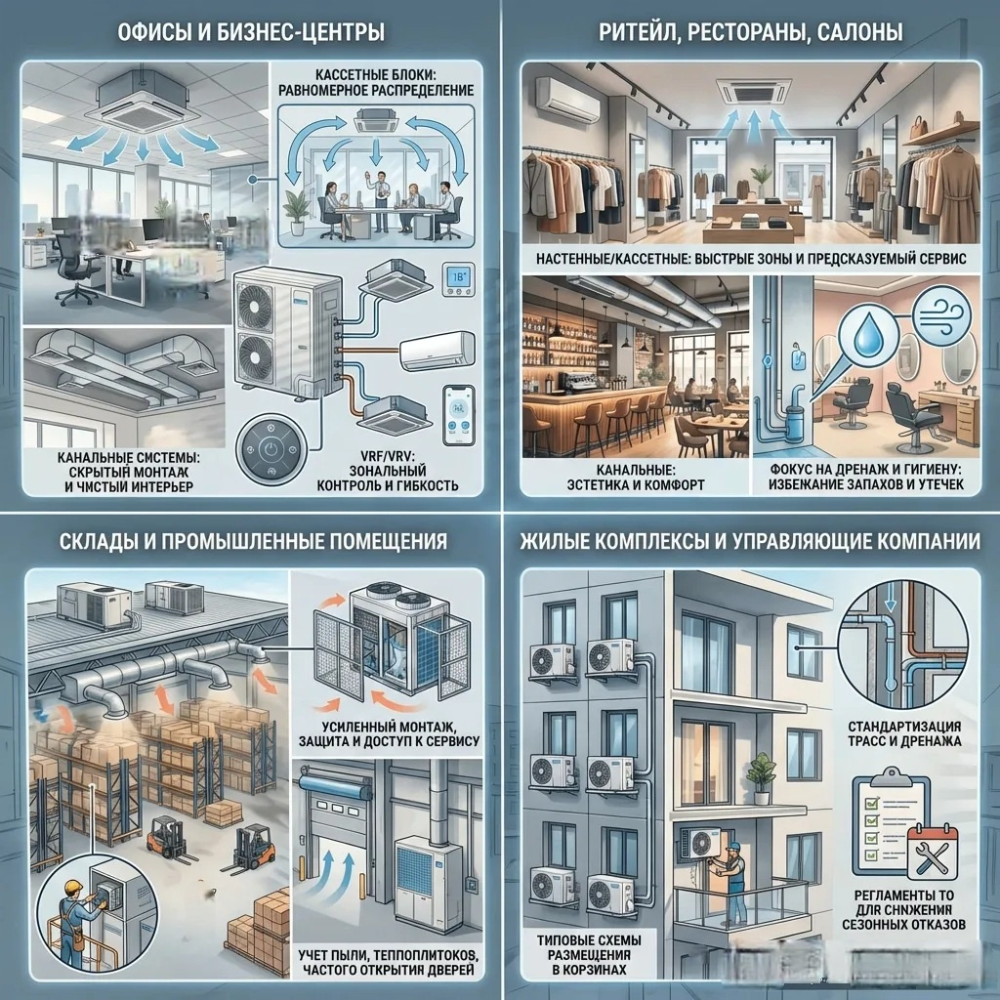 В офисах и БЦ выше нагрузка и требования к равномерности по зонам, чаще применяются канальные и кассетные решения и VRF/VRV. Также важны сервисные зоны, отчетность и возможность обслуживания без остановки работы.
