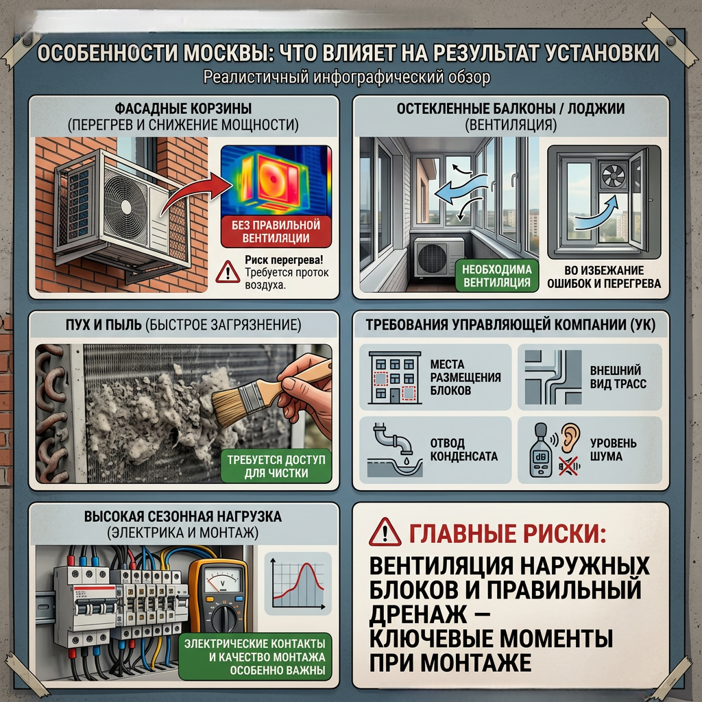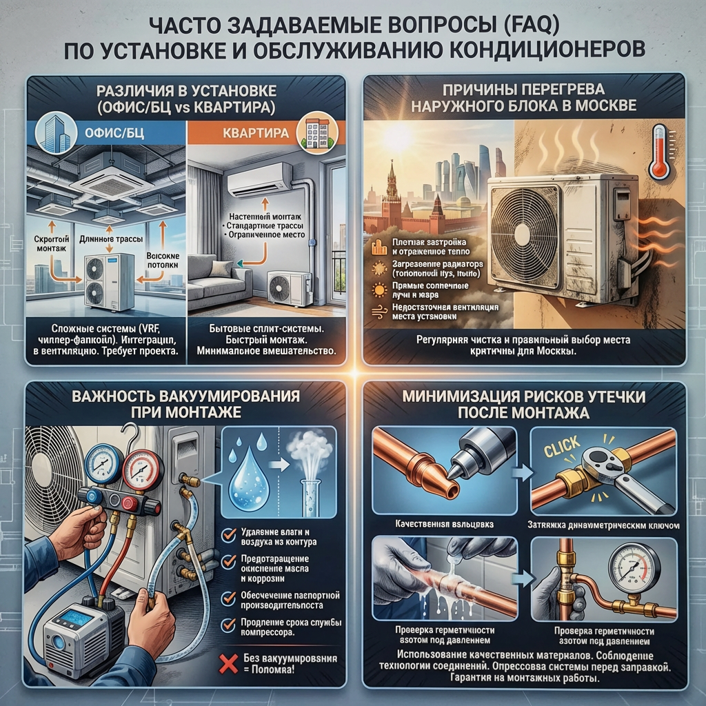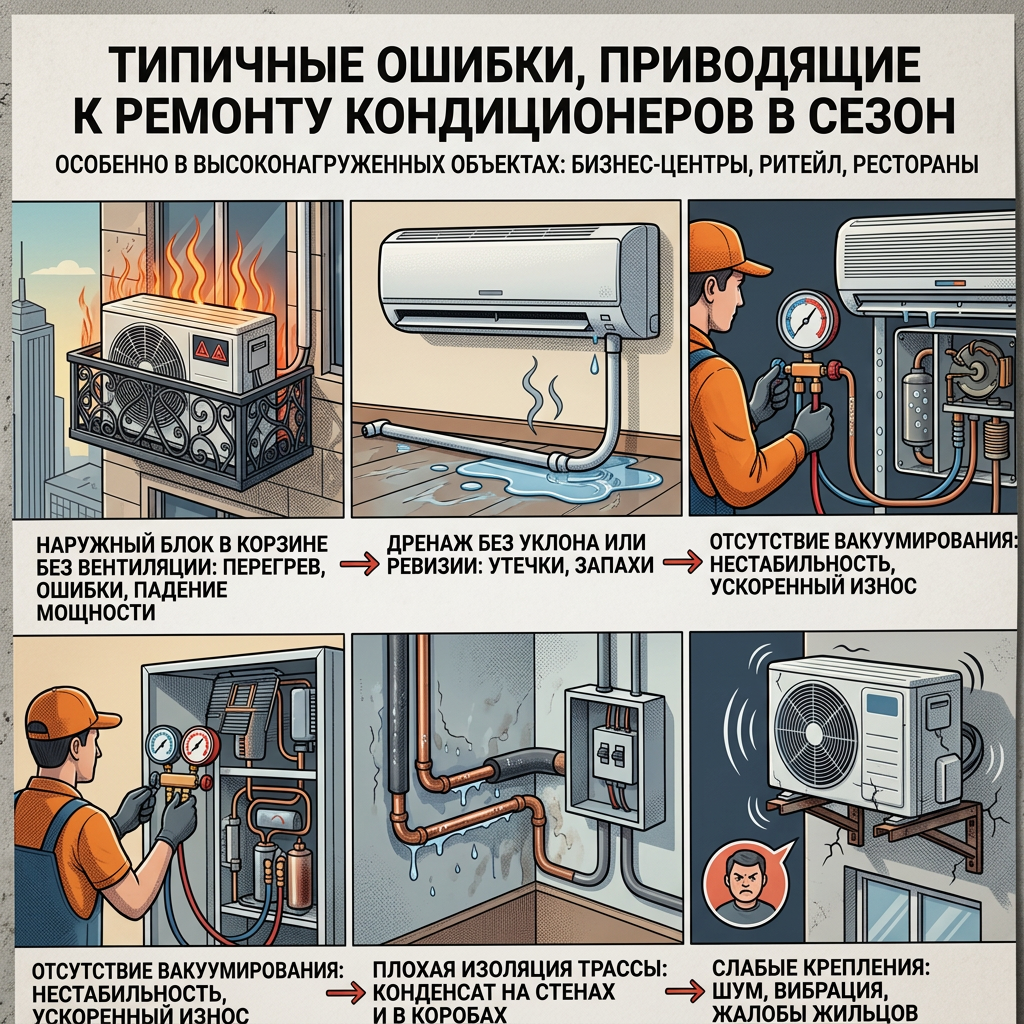 На объектах с высокой нагрузкой (БЦ, ритейл, рестораны) эти ошибки проявляются быстрее, чем в квартире. Поэтому профессиональный монтаж окупается стабильностью в сезон.