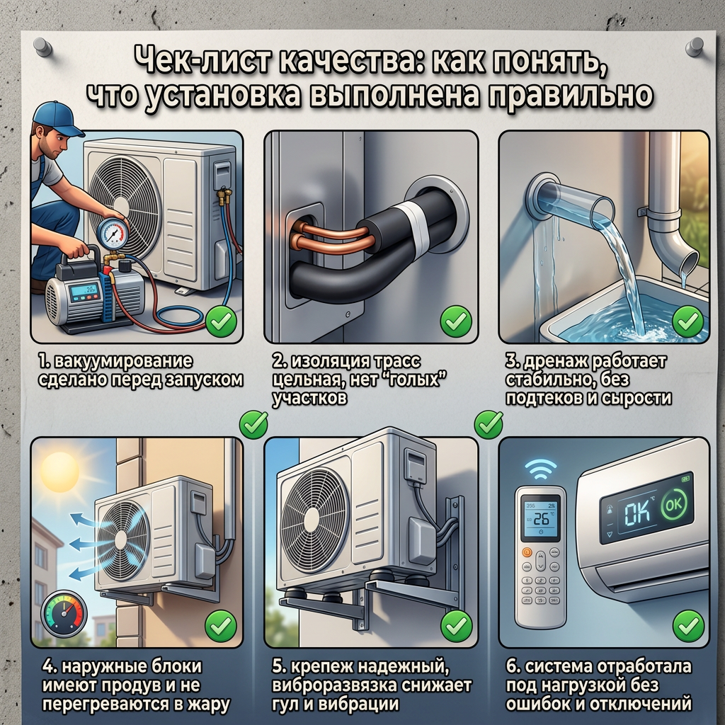 Попросите показать:вакуумирование, тест дренажа, запуск под нагрузкой и оценку продува наружного блока. Это 4 пункта, которые чаще всего “режут” в эконом-монтаже.